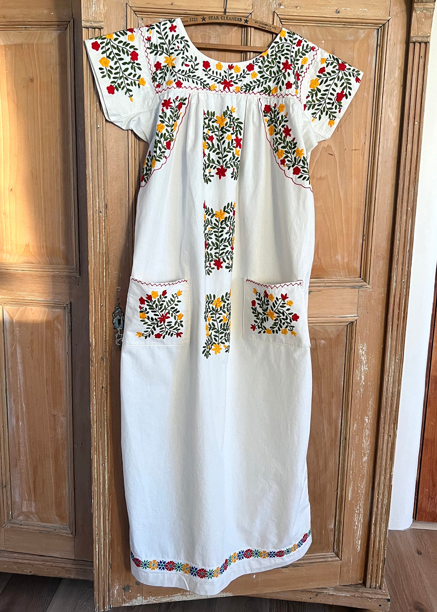 Oh boy, is this ever a beauty! Gorgeous hand embroidered vintage 70's Mexican tunic dress. I've seen a lot of these dresses and I have never seen one with these details. Hand sewn and embroidered with red, deep yellow, and olive green ... this wonderful collectible piece has vintage ribbon trim hand sewn at the hem and POCKETS. A classic Mexican tunic style with small gathers over the bust for shape. the fabric is a wonderful weight cotton. No labels, but undoubtedly professionally made. In excellent, like-new condition with no fabric or sewing flaws.