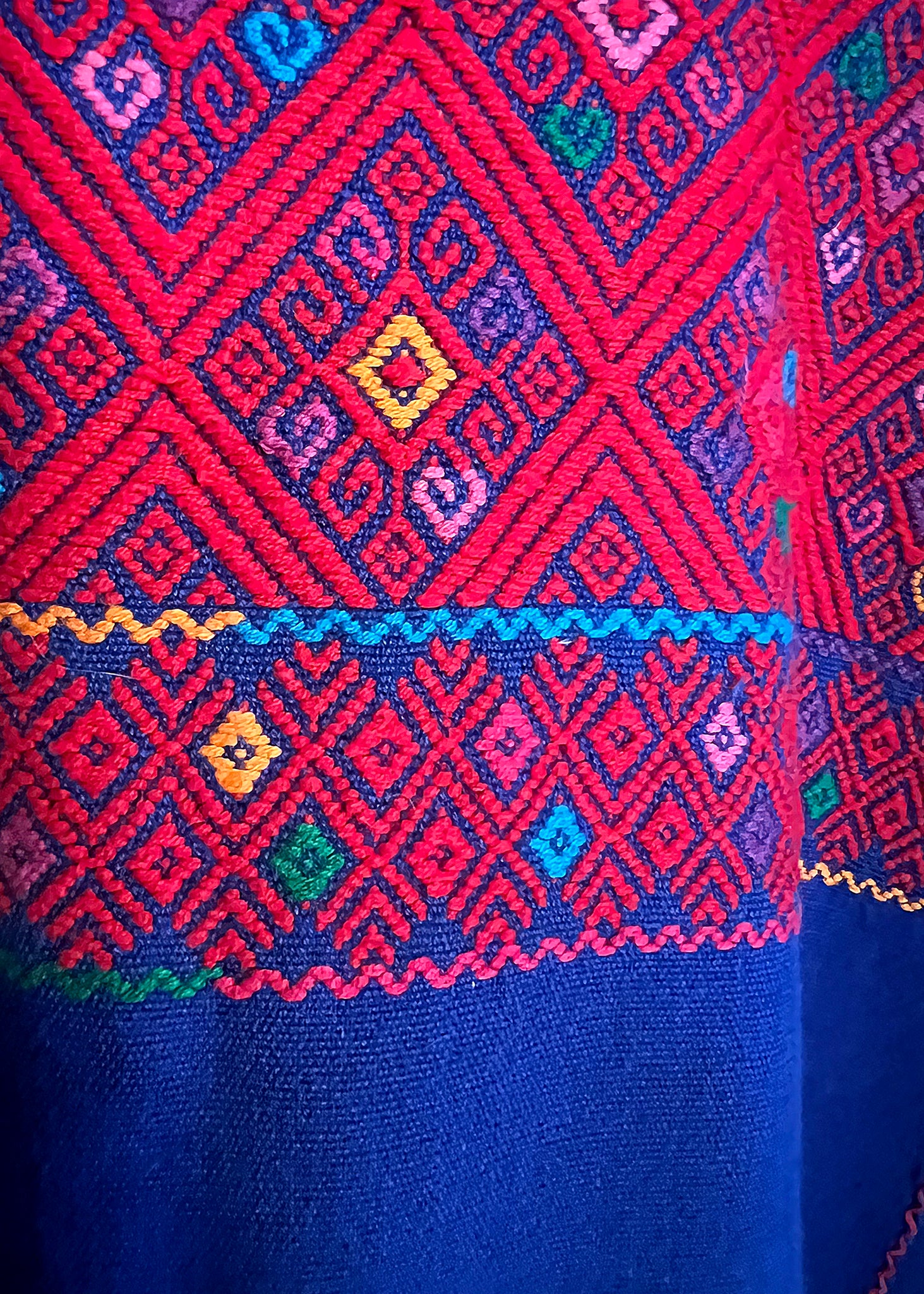 This vintage Guatemalan huipil is 100% hand made. The fabric has been hand-loomed in a deep royal blue with all of the red stitching loomed into the fabric at that time. The piece is then assembled with the additional colored embroidery hand-worked into the piece. This is a true treasure. That said, we consider pieces like this a wardrobe staple. This fabric is more of a three season weight - unless breezy summer nights on the beach are in your plans. We say, wear your heirlooms! :)